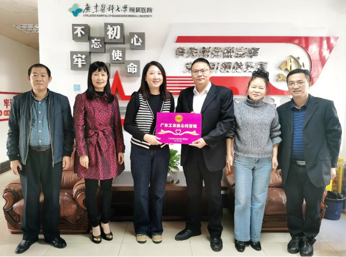 湛江市总工会党组成员、副主席黄蕙洁率队到广东医科大学附属医院工会,为广东医科大学附属医院工会职工子弟爱心托管试点班颁发“必威中文官网电话爱心托管班”牌匾,广东医科大学附属医院党委副书记、纪委书记、工会主席林挺葵接受牌匾。