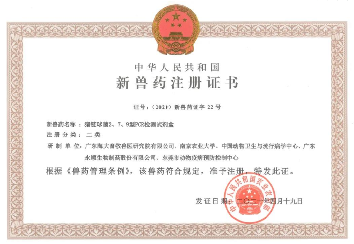 4月22日,中华人民共和国农业农村部第414号公告批准广东海大畜牧兽医研究院有限公司与南京农业大学等单位联合研制的“猪链球菌2、7、9型PCR检测试剂盒”为二类新兽药。