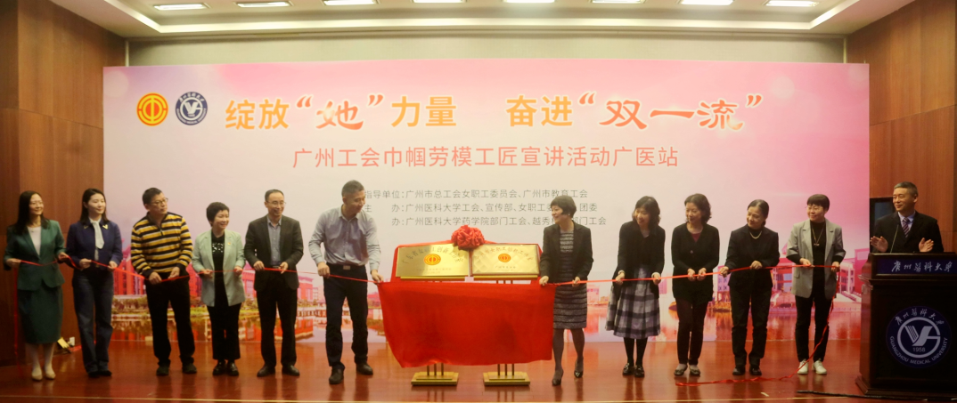 4月3日下午,广州市总工会党组成员、副主席王玉琴,广州市教育工会主席崔萍一行,到广州医科大学番禺校区开展巾帼劳模工匠宣讲进校园活动及女职工创新工作室揭牌仪式。广州医科大学校党委常委、副校长、工会主席周麟陪同,2位女职工创新工作室负责人,以及有关部处负责人,各学院教职工代表、学生代表约200人参加会议。