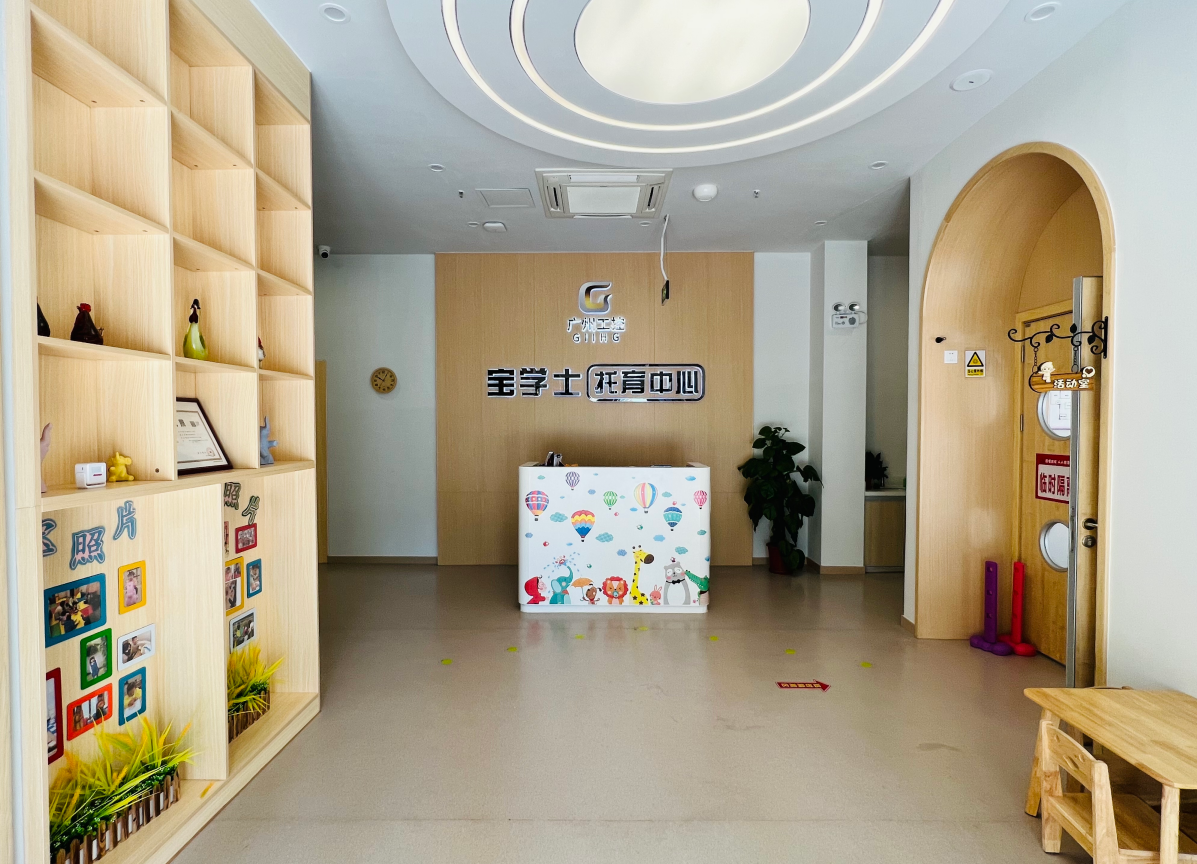 宝学士托育中心位于岭南V谷园区内 B2栋一楼,由广州工控集团工会举办,隶属广州工控健康教育投资有限有限公司管理。中心室内总面积约400平方米,设有活动室感统室、哺乳室、医务保健室、婴幼儿专用洗手间、淋浴区、配餐间、接待区及多个游戏区。活动室分为生活区和活动区,配备尿布台、清洁台、调制台、恒温饮水机、冰箱、空调等,满足婴幼儿的一日生活需求。
