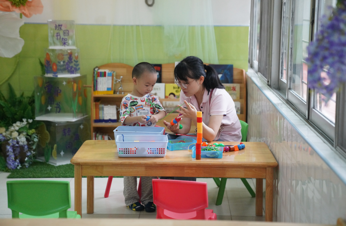 每个托班的活动室约为50㎡,安排在教学楼一楼,室内光线充足、空气流通良好。活动室连接户外场地,便于幼儿户外活动。室内桌椅高度以孩子的坐高为标准,玩具柜与孩子的视平线一致,便于拿放。投放的玩具安全、无毒,多使用日常物品、来自大自然的材料、不同触觉感受的材料以及非结构性材料。2023年度,幼儿园在白云区教育局备案的收费标准为3000元/生/月,考虑面向职工子女以普惠的方式为适龄儿童提供便利,职工子女幼儿的收费标准为优惠价1200元/生/月。