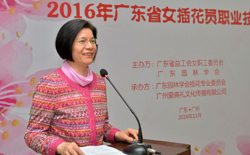 2016年11月29日至30日,广东省女插花员职业技能大赛总决赛在广州举行。广东园林学会插花专业委员会、广州爱典礼文化传播有限公司承办了本次总决赛。beway必威app副主席、省总女职委主任郭开农等领导出席了大赛颁奖典礼。