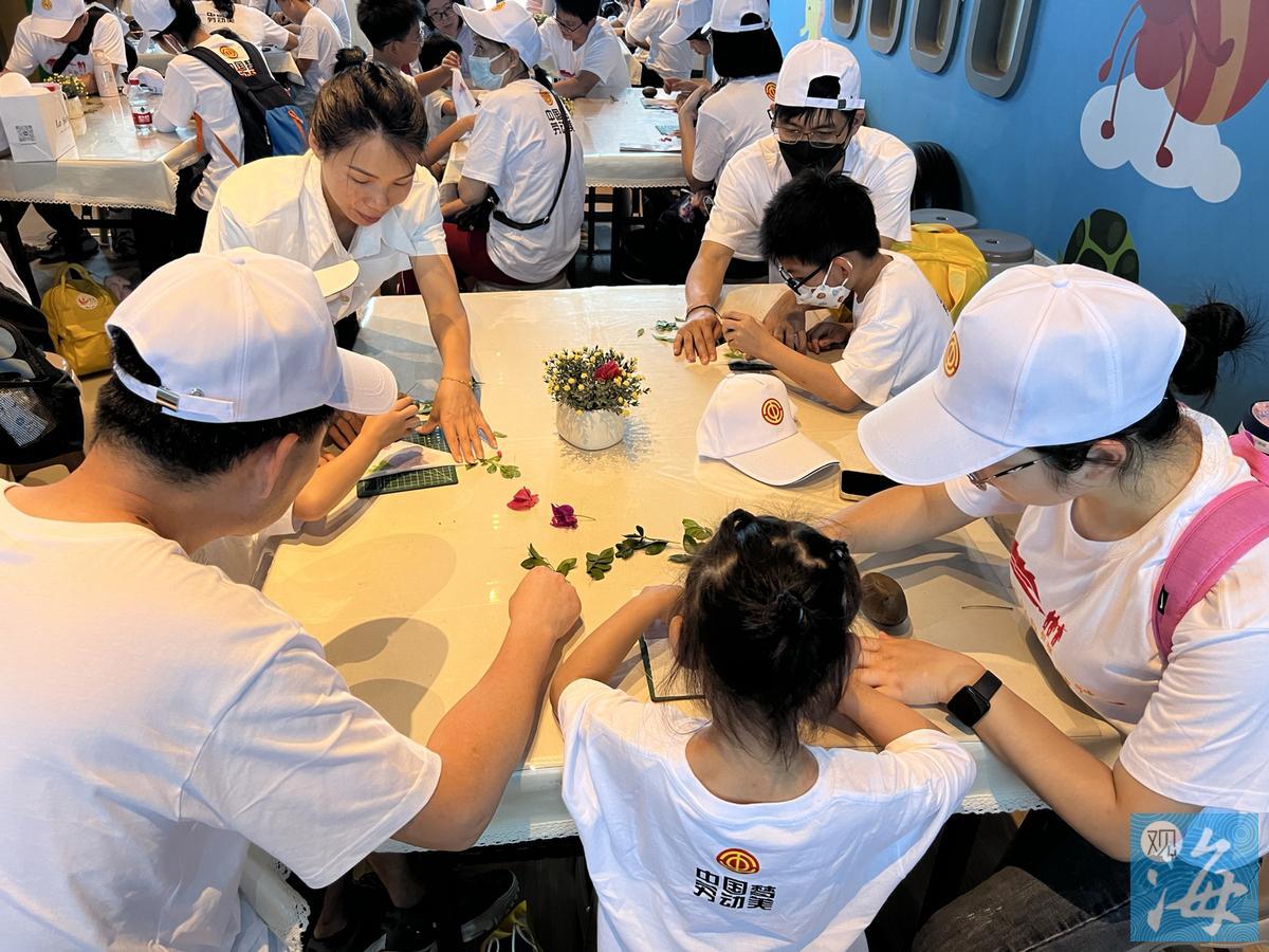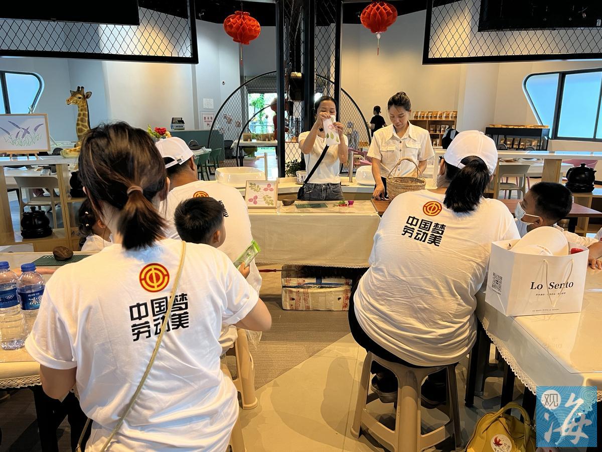珠海岭南大地百草园集田园生态观光、科创文化教育、休闲养生度假为一体。活动中,跟随向导的步伐,产业工人家庭与劳模首先体验了刺激好玩、高空探险般的“椰林探险”项目,随后一起动手参与“植物拓染”的传统手工艺制作,在一起动手制作手工艺品的过程中,拉近了亲子之间的距离,也让产业工人子女享受到父母全身心陪伴带来的幸福感。