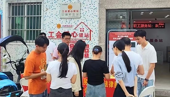 同时,区总工会还在洋老村户外劳动者工会爱心驿站设置了多个摊位,开展“粤工惠”推广宣传活动和“尊法守法·携手筑梦”服务农民工公益法律服务行动,区、镇工会工作人员手把手指导帮助职工们进行实名认证,解决职工群众实名注册遇到的问题,现场发放《工会法》《劳动合同法》《职工权益保障条例》及《民法典》宣传小册子,向广大职工群众宣传有关维护自身合法权益的法律法规。