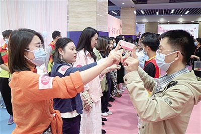 当天下午,近百名单身职工到达现场,以活力满满的状态去邂逅最心动的另一半,现场弥漫着浪漫气息。粉红气球、白色花束、精致糕点、低头私语的轻声慢诉、四目相对时眼角的笑意……活动开始前,男女嘉宾按组分成4支队伍,双双打卡完成“幸福青年向前冲”“幸福财你”“绽放青春寻缘乐”“出新出彩过三关”“财智决战一分钟”“幸福之约”等互动游园游戏,在轻松融洽的氛围中加深了解、增进感情。26对嘉宾现场牵手成功,擦出爱情的“火花”。