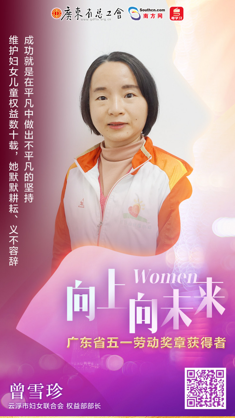 她曾获评为全国维护妇女儿童权益先进个人、全国青少年毒品预防教育“6.27”工程优秀校外辅导员、云浮市“七五”普法先进个人、市实施妇女儿童发展规划先进个人、市直机关优秀共产党员。来自云浮市妇女联合会的曾雪珍在推动反家庭暴力联合机制建设、参与婚姻家庭纠纷化解、救助困境妇女儿童、关爱保护农村留守儿童等重点领域方面作出重要贡献。