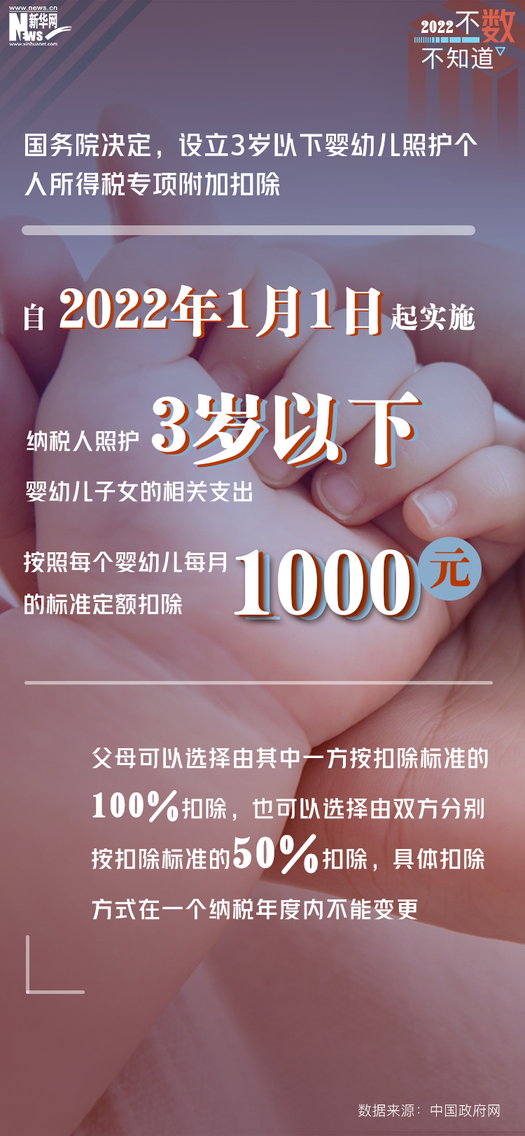 新华社北京3月28日电 为贯彻落实《中共中央 国务院关于优化生育政策促进人口长期均衡发展的决定》,依据《中华人民共和国个人所得税法》有关规定,国务院决定,设立3岁以下婴幼儿照护个人所得税专项附加扣除。自2022年1月1日起,纳税人照护3岁以下婴幼儿子女的相关支出,在计算缴纳个人所得税前,按照每个婴幼儿每月1000元的标准定额扣除。该项扣除政策有利于减轻人民群众抚养子女负担,体现了国家对人民群众生育养育的鼓励和照顾。