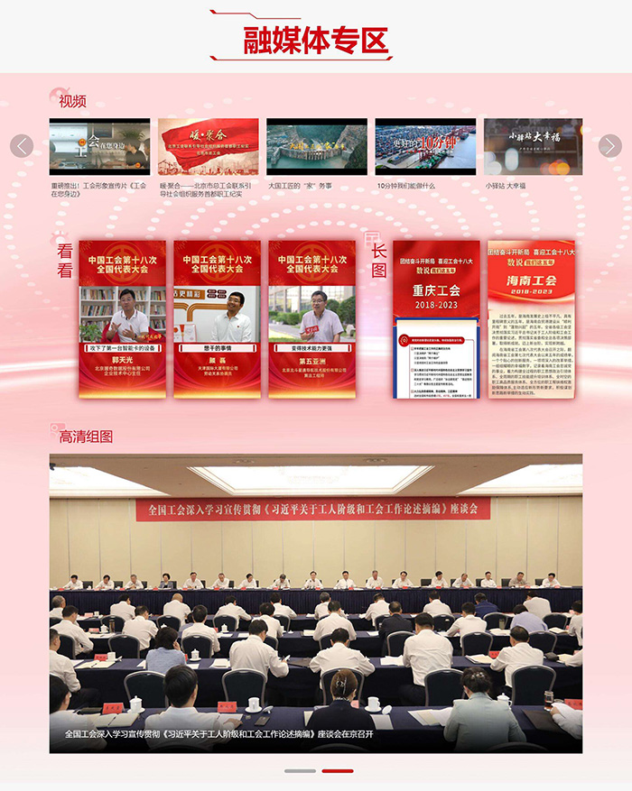 中国工会十八大新闻中心网站支持PC端和移动端适配,集权威发布、融媒展示等功能于一体,实现全媒体、多终端、广覆盖。