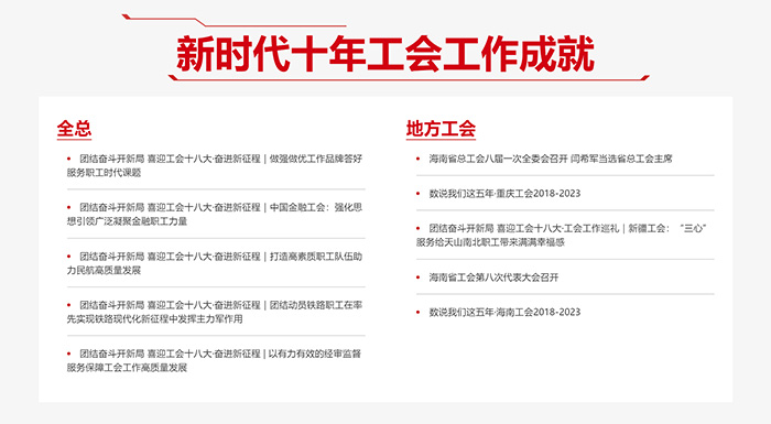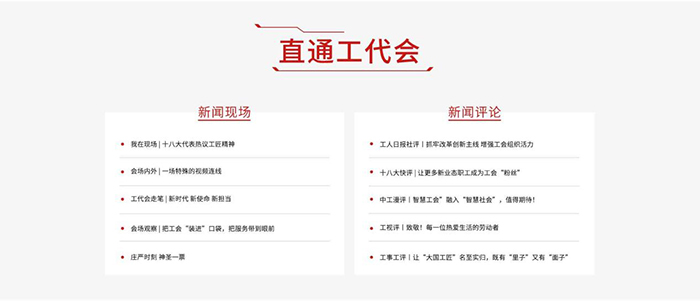 用户可以从该网站开设的“权威发布”“融媒体专区”“直通工代会”“代表之声”“新时代十年工会工作成就”等版块中,获悉中国工会十八大的所有内容。