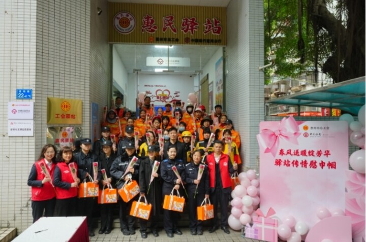 人间最美三月天,春花烂漫绽新颜。为了加强对女性户外劳动者关心关爱,在第115个“三八”国际劳动妇女节到来之际,3月6日上午,惠州市总工会联合中国银行惠州分行(以下简称“惠州中行”)在惠州中行惠民驿站开展“春风送暖绽芳华 驿站传情慰巾帼”关爱活动,吸引50多名来自环卫、外卖、协警、安保等行业的女性户外劳动者前来参加。